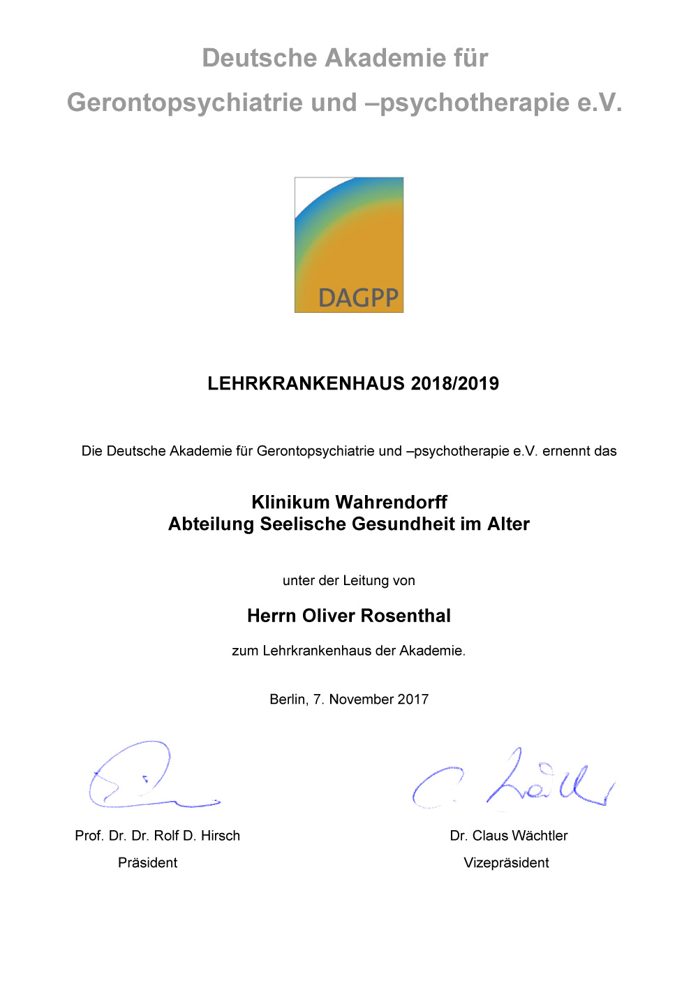 Die Deutsche Akademie für Gerontopsychiatrie und –psychotherapie (DAGPP) hat das Wahrendorff Klinikum mit seiner Abteilung für Seelische Gesundheit zum Lehrkrankenhaus der Akademie ernannt.